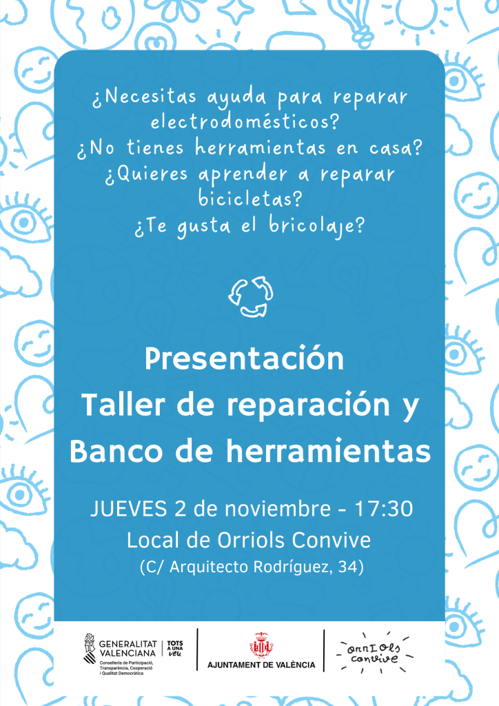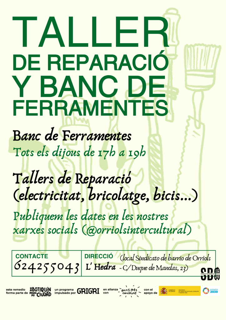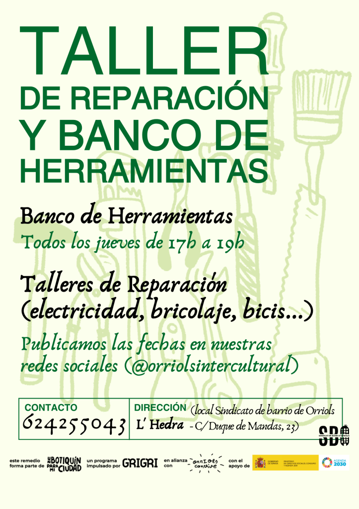 El 27 de noviembre de 2024 representando el Taller de Reparación nuestro compañero Josué participa en el conversatorio Barrios Verdes, Huevinars en Un Botiquín para mi Ciudad, organizado por Grigri Projects dentro del proyecto Un Botiquín para Orriols, donde reflexionamos con experiencias de Vallecas y Ceuta sobre la sostenibilidad. Escucha el huevinar Barrios Verdes aquí: