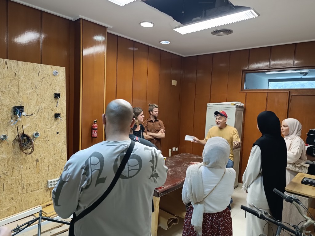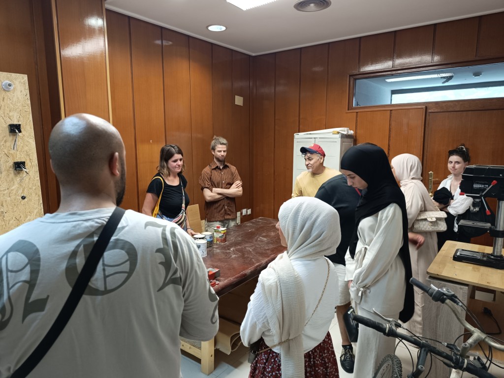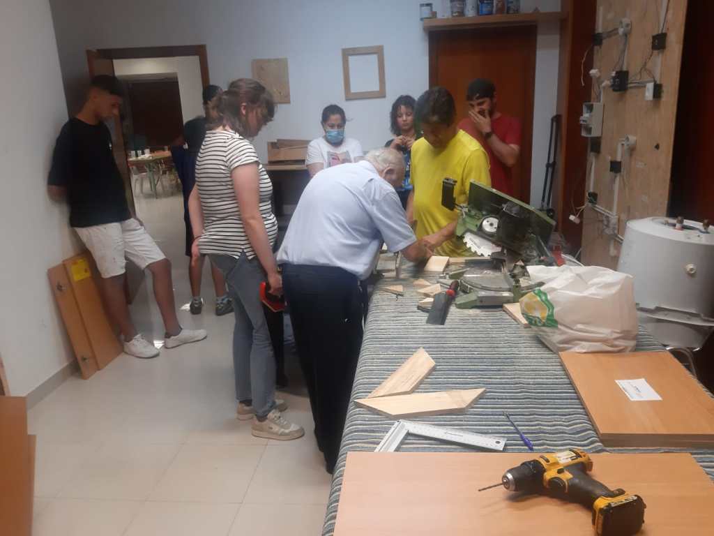 El grupo de reparación construye una mesa para corte de madera. Nos visita un grupo de alumnos/as de trabajo social de Berlín, acompañados por la Asociación Valencia Acoge.