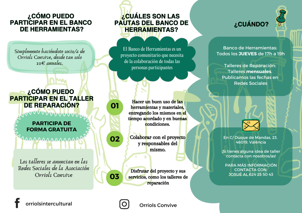 Esta actividad se trata de un préstamo de herramientas y materiales comunitario, en el que se invierte en materiales a disposición de vecinas y vecinos del barrio. Se fomenta por una parte la reutilización de materiales y herramientas compartiendo los materiales. Por otra parte se impulsa la colaboración vecinal, trabajando a través de compartir y comprendiendo acciones cotidianas desde lo comunitario.